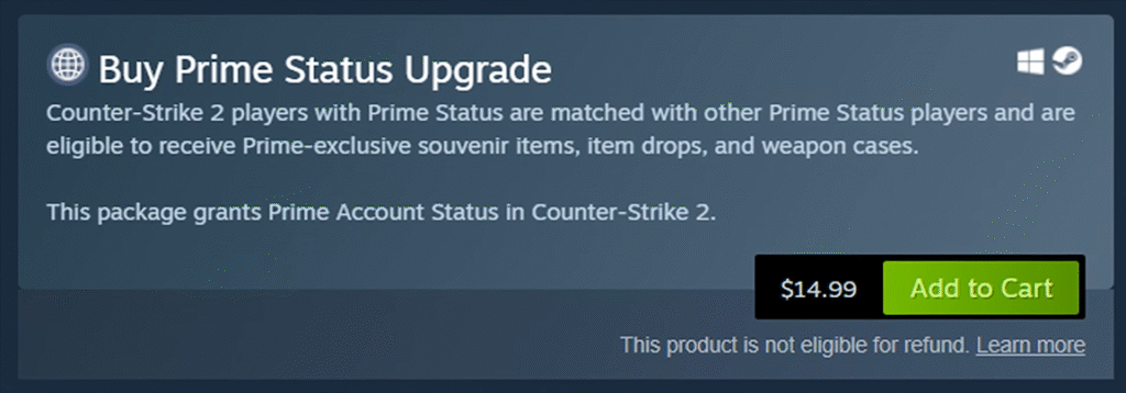 Now, in CS2, there’s no legitimate way to get Prime for free. You must purchase it directly from Steam.