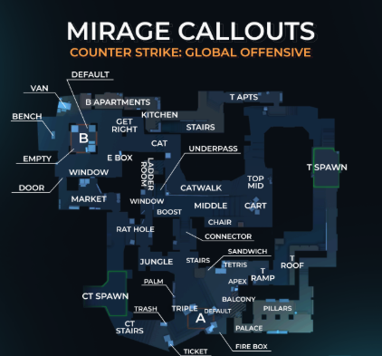 Great for A splits coming from Mid. If you want to understand callouts better for mid-round read our Mirage Callouts Guide.