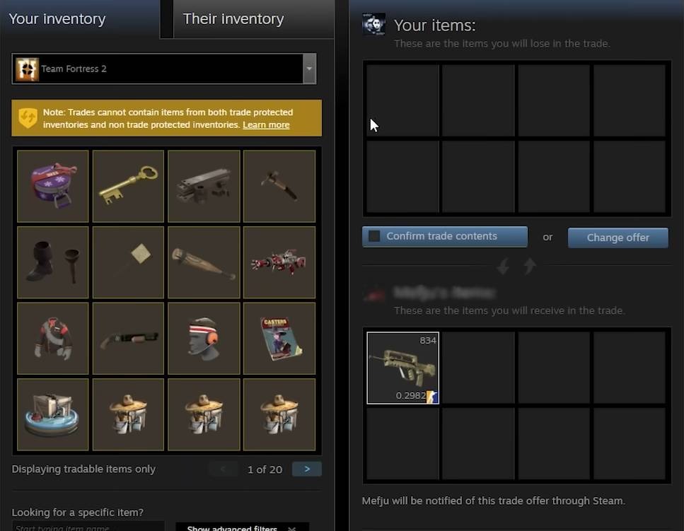 Some items are marked as Trade Protected after updates or suspicious trade patterns.
